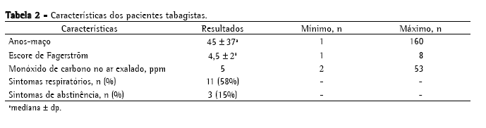 Os 19 fumantes atuais eram do sexo masculino, tinham menor idade (58 ± 17 anos) em comparação aos não-fumantes (68 ± 12 anos) e ex-fumantes (73 ± 14 anos)-ANOVA: F = 6,57 (p = 0,002); e fumaram em média 43 anos-maço. A média do escore de Fagerström foi de 5,0 (variação, 1-8). Dos fumantes, 11 (58%) tinham sintomas respiratórios, e 3 (15%) tinham sintomas de abstinência. A mediana do COex nos fumantes atuais foi de 5,0 ppm (variação, 2-53 ppm). Dos 19 fumantes, 8 (7% do total da amostra) tinham níveis de COex ≥ 6 ppm (Tabela 2).