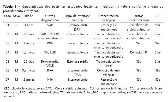 Conforme as broncoscopias e TCs realizadas, a extensão das estenoses foi classificada como curta, em três pacientes; média, em um; e longa, em três. As seguintes anomalias intracardíacas foram observadas em dois pacientes: tetralogia de Fallot em um, e uma associação de comunicação interventricular e comunicação interatrial em um. Outras anomalias congênitas observadas foram: dextrocardia e veia cava superior esquerda, ambas no mesmo paciente; duplo arco aórtico, tipo IA da classificação de Mayo, em um; e anus imperfurado, em um. Dois pacientes apresentavam sling de artéria pulmonar. As características demográficas dos pacientes em estudo estão descritas na Tabela 1.