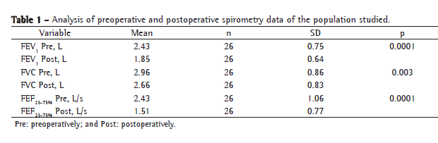 Spirometry was performed using a MicroLoop spirometer (Micro Medical Ltd., Kent, England), which is accepted by international guidelines, according to a procedure described elsewhere.(11) The values obtained in the evaluation after a postoperative period of six months were compared with those obtained in the ­preoperative period.