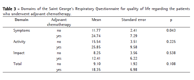 When the patients were analyzed regarding gender, smoking history, type of tumor (primary or metastatic) and extent of the resection, no significant differences were observed in the scores for the various domains of either of the two QoL questionnaires applied (general and specific). However, the symptoms domain scores were significantly higher among the patients who underwent adjuvant chemotherapy than among those who did not (Table 3).