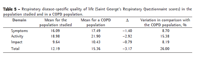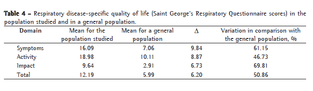 The SGRQ addresses aspects regarding three domains: symptoms; activity; and psychosocial impact of the respiratory disease. Each domain has a maximum possible score. The scores obtained for all of the questions in a given domain are summed, and the total is expressed as a percentage of the maximum for that domain. Values greater than 10% reflect altered QoL in that domain. Post-intervention variations equal to or greater than 4%, in any given domain or in the total score, indicate a significant change in patient QoL.(12)