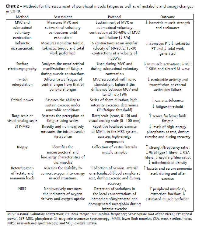 In view of the evidence of peripheral muscle function impairment and in view of the different mechanisms determining susceptibility to fatigue in COPD patients, knowledge of the distinct functional assessment methods available (Chart 2) is absolutely necessary so that it is possible to discriminate the main component involved in the process of peripheral muscle fatigue in these patients. However, some aspects in the choice of the method of assessment, such as the availability and reliability of the equipment, its cost-benefit ratio and its user-friendliness, in addition to patient cooperation, should also be considered.