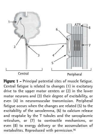 Classically, muscle fatigue is defined as the inability of the muscle to generate or maintain the levels of strength required for a given work rate.(4) Muscle fatigue can be divided into two components: central and peripheral. This terminology is based on the anatomical and functional sites involved in the fatigue process. In central fatigue, muscle activation by the central nervous system is impaired, whereas, in peripheral or contractile fatigue, the involvement occurs distally to the neuromuscular junction.(5) A pictorial representation of the structures involved in central and peripheral fatigue is presented in Figure 1.