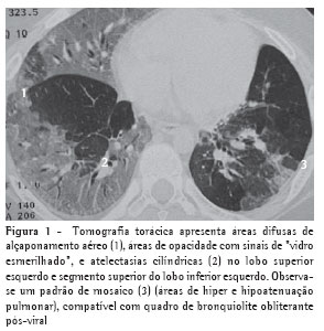 A cintilografia perfusional pulmonar demonstrou alteração da perfusão pulmonar bilateralmente, com mais intensidade à esquerda. A tomografia computadorizada de tórax evidenciou áreas difusas de aprisionamento aéreo (padrão discreto em mosaico), atelectasias e bronquiectasias cilíndricas do lobo superior esquerdo e segmento superior do lobo inferior esquerdo (Figura 1). Os achados da tomografia computadorizada de tórax foram compatíveis com BO.