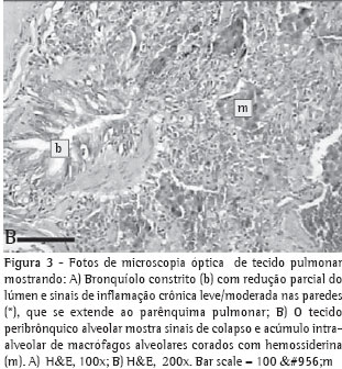 Observaram-se áreas micro-hemorrágicas em ambos os pulmões. O tecido peribrônquico alveolar mostrou sinais de colapso e acúmulo intra-alveolar de macrófagos alveolares corados com hemossiderina. Os bronquíolos apresentaram aspecto constritivo com espessamento da mucosa e discreta inflamação com extensão ao parênquima pulmonar.