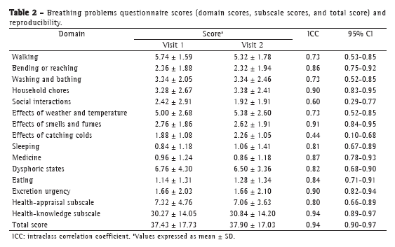 The study population consisted of patients treated at the outpatient clinics of the HCPA Department of Pulmonology. We included individuals aged  18 years and diagnosed with non-cystic fibrosis bronchiectasis on the basis of clinical criteria and radiological or CT criteria.(15) The diagnosis was confirmed by a physician who was a member of the research team. The inclusion criteria were as follows: having had at least one chronic or recurrent respiratory symptom (cough, expectoration, dyspnea, hemoptysis, or recurrent respiratory infection) for two years or more; having an FEV1  70% of predicted; and being clinically stable, clinical stability being defined as no hospitalization for at least 30 days and absence of clinical changes requiring changes in the maintenance treatment of the disease.