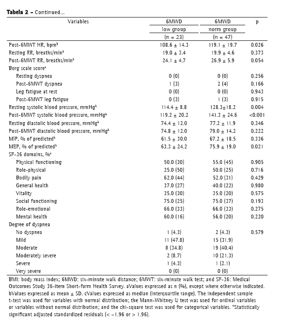 For statistical analysis, the patients were divided into two groups: 6MWD-low (6MWD below the predicted lower limit); and 6MWD-norm (6MWD equal to or greater than the predicted lower limit).(22)