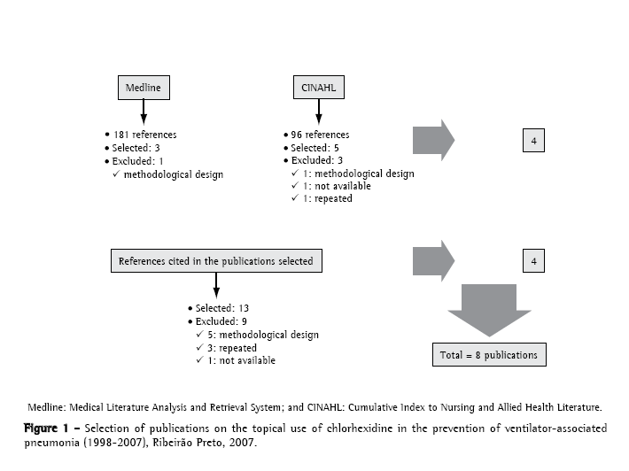 The articles were selected using two major heath care databases, accessed via the Internet: the Medical Literature Analysis and Retrieval System (Medline) and the Cumulative Index to Nursing and Allied Health Literature (CINAHL). The following keywords, which are included in the Medical Subject Headings, were used in the search: pneumonia, ventilator-associated; oral hygiene; chlorhexidine; cross infection/prevention and control; critical care; and intensive care. In addition, a search was carried out in the references cited in the articles selected using the databases.