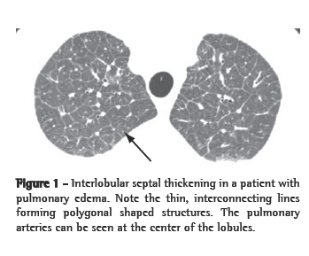 Interlobular septal thickening (Figure 1) is defined as thickening of the interstitium that surrounds and delineates the secondary pulmonary lobule. Septal lines tend to be straight and 1-2 cm in length. The centrilobular artery, which lies in the center of the pulmonary lobule, is often visible. A few interlobular septa are often seen in normal patients. In abnormal patients, however, many will be seen, outlining the polygonal lobules. It is important to note that septal thickening can be seen in a wide variety of diseases. This finding is most useful when it is the predominant abnormality, in which case the differential diagnosis is limited and depends upon whether the thickening is smooth, nodular, or irregular (Chart 2). The clinical context, especially information regarding the duration of clinical symptoms and the tempo of disease progression, is extremely helpful in the interpretation of interlobular septal thickening.