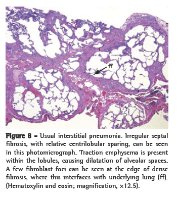 A surgical lung biopsy finding of UIP is characteristic of IPF, which is a chronic idiopathic form of lung fibrosis. The histopathology of UIP is one of destructive fibrosis alternating with normal lung in the surgical biopsy specimen (Figures 7 and 8). A characteristic advancing edge of focal injury is always present and is referred to as "fibroblastic foci". Clinical diagnostic criteria for UIP were proposed by a consensus committee of the American Thoracic Society/European Respiratory Society in 2000.(10)