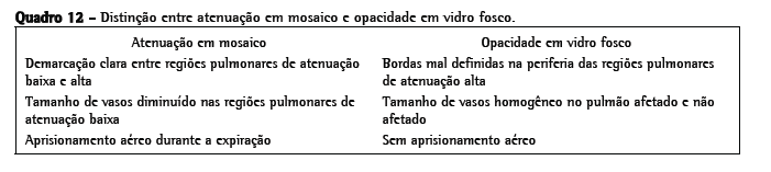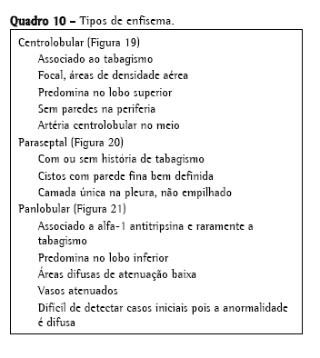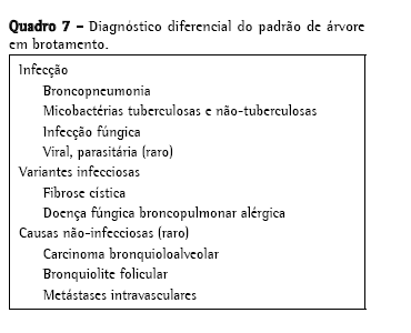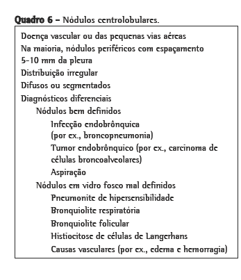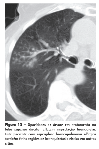 Nódulos centrolobularesA parte central do lóbulo pulmonar secundário contém os ramos dos bronquíolos terminais, suas respectivas artérias pulmonares e, adjacente a estas, o tecido conjuntivo de suporte com vasos linfáticos. Portanto, opacidades nodulares centrolobulares podem ser o produto de doenças bronquiolares e peribronquiolares assim como de doenças vasculares e perivasculares. Atenuação em mosaico associada a aprisionamento aéreo na TCAR expiratória, ou evidências funcionais de obstrução de fluxo aéreo indica doenças envolvendo as vias aéreas periféricas. Nódulos centrolobulares algumas vezes são acompanhados pelas chamadas opacidades de "árvore em brotamento", nas quais a anormalidade lembra uma árvore brotando (Figura 13). Na maioria dos casos, o padrão de árvore em brotamento ocorre como resultado de doenças infecciosas. Árvore em brotamento é um subtipo do padrão centrolobular. Patologicamente, esta anormalidade representa impactação bronquiolar e é quase sempre devida a infecções. O Quadro 7