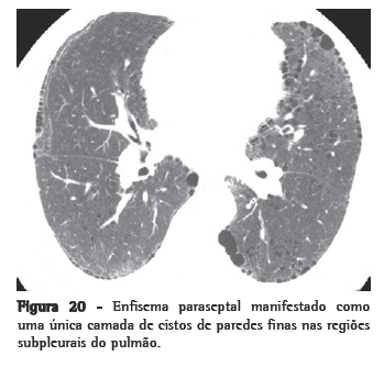 FaveolamentoO remodelamento do pulmão em favo de mel (faveolamento) reflete o estágio terminal de um número de doenças que causam destruição do parênquima. Apresenta um padrão característico na TCAR, com cistos subpleurais com paredes espessas que compartilham paredes e, quando avançado, geralmente formam empilhamentos em camadas múltiplas (Figura 6). É tipicamente acompanhado por outros sinais de fibrose (bronquiectasia de tração e reticulação). O faveolamento fortemente sugere um diagnóstico patológico de pneumonia intersticial usual (PIU), embora ele possa ser atribuído a outras doenças (Quadro 3). O faveolamento observado na TCAR é geralmente considerado como diagnóstico de PIU em pacientes apresentando perfil clínico apropriado, e a maioria desses pacientes não necessita de biópsia pulmonar cirúrgica. Como o faveolamento bilateral em TCAR é considerado diagnóstico sob estas condições, é de vital importância que o radiologista tenha a certeza de que o faveolamento está presente antes de descrevê-lo.