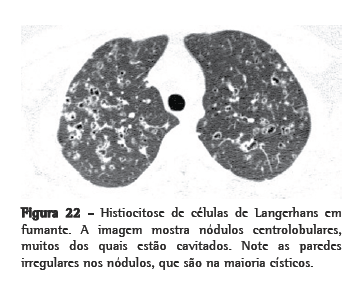 Em fumantes, nódulos centrolobulares mal definidos podem também ser visualizados em estágio inicial de HCL, sem a presença de cistos. Visto que HLC é uma doença com base nas vias aéreas, um achado em biópsia transbrônquica de lesão de HCL não é inesperado. As células de Langerhans podem ser encontradas no fluido do LBA de pacientes com um dos vários tipos de condições inflamatórias, potencialmente produzindo um resultado falso-positivo se esta modalidade for utilizada como um teste diagnóstico para HCL.(41) A compreensão dos achados de TC é essencial para o diagnóstico acurado. A incidência exata de HCL na população tabagista continua desconhecida.(52)
