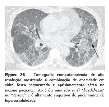 Reações de hipersensibilidade a antígenos orgânicos inalatórios abrangem um grupo de doenças pulmonares difusas mediadas por reações imunes e provocadas pela inalação repetitiva de uma ampla variedade de poeiras orgânicas, bioaerossóis e compostos químicos. Estas doenças são coletivamente classificadas como pneumonite de hipersensibilidade (PH). A exposição continuada a tais antígenos tipicamente ocorre nos domicílios. No Brasil, ela é especialmente associada a aves domésticas e a grandes concentrações de bolores dentro dos ambientes.(15) Na PH crônica, achados em TCAR indicativos de fibrose estão presentes e relacionam-se com pior prognóstico. O faveolamento é comum nas formas crônicas. Em um estudo realizado no Brasil, o faveolamento estava presente em 48 (57%) dos 85 pacientes submetidos à biópsia pulmonar cirúrgica.(16) A doença estava restrita aos lobos superiores em apenas 11 casos. Entretanto, quando havia envolvimento dos lobos inferiores, outros achados indicativos de PH, tais como nódulos centrolobulares, áreas de atenuação diminuídas, áreas de atenuação em vidro fosco e distribuição peribrônquica das lesões, estavam comumente presentes. Em amostras de biópsia, isto é traduzido como infiltração intersticial inflamatória crônica, concentrada ao redor das vias aéreas e freqüentemente acompanhada por bronquiolite crônica e pequenos granulomas intersticiais não-necrotizantes. Em somente 6% dos casos, a TC revelou distribuição periférica de faveolamento, mimetizando PIU. Nenhum dos pacientes apresentou lesões similares a PIU nas biópsias pulmonares. Estes achados são semelhantes aos de outros estudos.(17,18) Em pacientes com doença pulmonar fibrosante e expostos a antígenos provocadores de PH, um diagnóstico clínico pode ser aceito desde que o contexto da TC seja apropriado e a citologia do LBA revele linfocitose.(19)