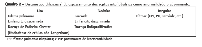 Espessamento dos septos interlobularesO espessamento dos septos interlobulares (Figura 1) é definido como o espessamento do interstício que envolve e delineia o lóbulo pulmonar secundário. As linhas dos septos tendem a ser retas e com 1-2 cm de comprimento. A artéria centrolobular, localizada no centro do lóbulo pulmonar, é geralmente visível. Alguns septos interlobulares são normalmente visualizados em pacientes normais. Em pacientes com anormalidades, entretanto, muitos podem ser visualizados, delineando os lóbulos poligonais. É importante enfatizar que o espessamento dos septos ocorre em uma grande variedade de doenças. Este achado é mais útil quando é a principal anormalidade, quando o diagnóstico diferencial é limitado e dependente do tipo de espessamento: liso, nodular ou irregular (Quadro 2). O contexto clínico, em especial as informações a respeito da duração dos sintomas clínicos e o tempo de progresso da doença, é extremamente útil na interpretação do espessamento dos septos interlobulares.