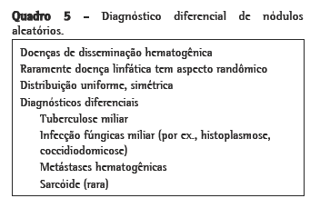 As lesões pulmonares linfóides constituem uma categoria geral de doenças que inclui bronquiolite folicular, hiperplasia linfóide nodular, pneumonia intersticial linfóide e linfoma de baixo grau.(9) Em casos raros, a hiperplasia linfóide pode simular a sarcoidose, visto que o envolvimento é concentrado ao longo dos septos, em áreas subpleurais e ao redor das vias aéreas (todas os locais de canais linfáticos no pulmão).