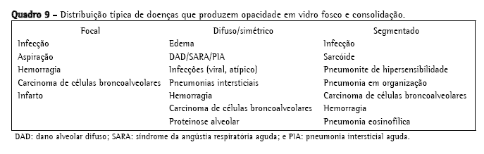 vários achados tomográficos podem ser combinados para formar padrões típicos. Estes, conjuntamente com a distribuição anatômica dos