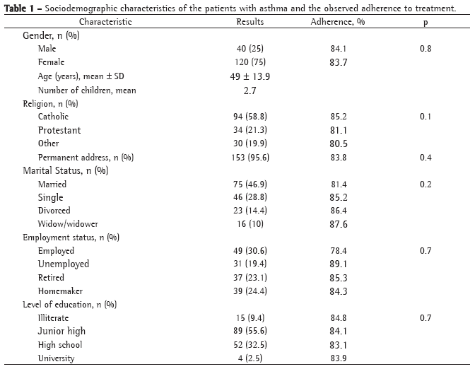 One hundred-sixty patients were included. Of those, 120 (75%) were female, with a mean age of 49 ± 14 years. Adherence to the use of IC was evaluated in 158 patients, and 112 (70.9%) were considered adherent according to the adopted cut-off point. The rate of adherence in the sample was 83.9% of the used doses. Adherence was not evaluated in two patients, since they withdrew the informed consent and decided to leave the study. Sociodemographic data and data on patient adhesion according to each variable are described in Table 1.