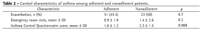According to the Asthma Control Questionnaire, 60 patients (38%) presented controlled asthma. The rate of adherence to treatment among patients with controlled asthma was 88.5% of the doses. In the group of patients with uncontrolled asthma, adherence was 80.9%. This result was significant (p < 0.001). The estimated risk of uncontrolled asthma was 2.9 times higher among nonadherent patients than among adherent patients (95% CI: 1.3-6.4). Table 2 presents the characteristics of asthma control in both groups of patients: those that were adherent to the treatment and those that were nonadherent.