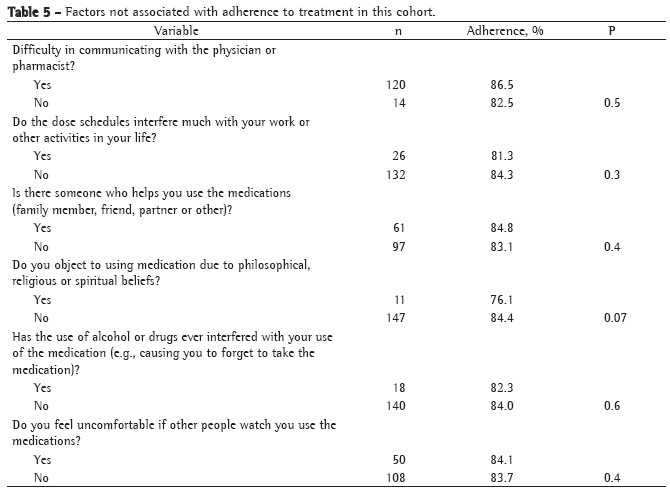 Table 5 presents the other variables that had no relation to adherence to treatment.