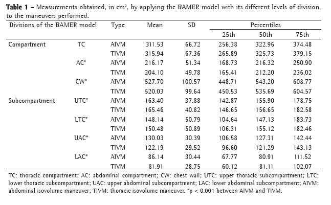 In view of the results obtained, we can propose the application of the BAMER model to observe the evolution of respiratory muscle control resulting from strategies such as respiratory therapy,(22,23) global postural reeducation(24) and Pilates training, used as complements to the standard treatment of respiratory disease. These complementary resources make use of the determination of IVM variations as a technique for respiratory exercises, in which the control of the maneuver is conscious and voluntary. It is fundamental that the active and passive forces acting upon the CW during the respiratory movement be controlled by muscular, elastic and pressure elements, so that a person performing an IVM has voluntary control of all these elements. The BAMER model has proven effective at taking measurements in this context.