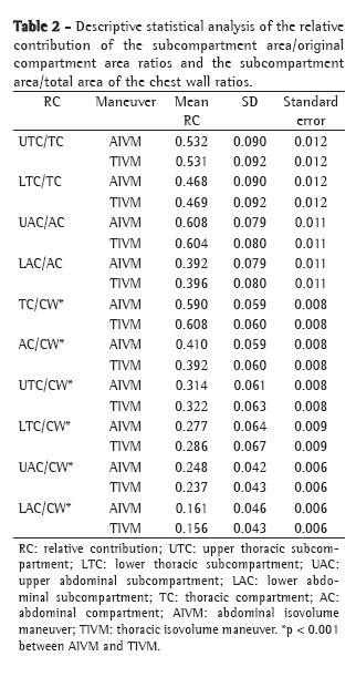 The use of photogrammetry for the analysis of the two-dimensional thoracoabdominal respiratory movement has made it possible to obtain, in a clear and simple manner, evidence regarding relationships between movement and volume under known conditions, as well as results previously described using more robust systems.(13,15) This is possible because the BAMER model is able to quantify the differences between the AIVM and TIVM in terms of the accommodation of the areas.(10) The use of the supine position to test the BAMER model in children in the present study is in accordance with the corollary stating that a fixed position is required for the IVMs to be executed.(13)