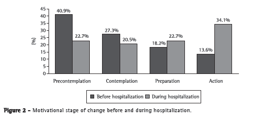 Regarding the motivation to quit smoking, the precontemplation stage was found to be the most common motivational stage of change immediately before hospitalization (40.9%). During hospitalization, the action stage of change predominated (34.1%). Before hospitalization, only 31.8% of the smokers were in the preparation or action stages of change, whereas during hospitalization that proportion increased to 56.8% (Figure 2).