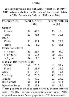 Objetivo: Considerando a relevância da co-infecção vírus da imunodeficiência humana/tuberculose, este estudo foi desenvolvido para determinar a prevalência e os fatores associados à tuberculose em pacientes residentes em uma zona de alta prevalência das duas infecções. Métodos: Todos os pacientes atendidos no ano de 1999 no Serviço HIV/AIDS do Hospital Universitário da Universidade Federal do Rio Grande foram avaliados retrospectivamente desde o momento do diagnóstico da presença do vírus da imunodeficiência humana, em relação à ocorrência de tuberculose e sua associação com fatores sociodemográficos, comportamentais e imunológicos. Resultados: A amostra incluiu 204 pacientes e a prevalência encontrada de tuberculose foi de 27%. A análise multivariada mostrou que existe uma associação significativa do desenvolvimento de tuberculose com a raça negra (razão de chance: 4,76; intervalo de confiança de 95%: 1,93 -11,72) e uma relação inversa com a contagem de linfócitos TCD4+ no momento do diagnóstico do vírus da imunodeficiência humana (razão de chance: 0,995; intervalo de confiança de 95%: 0,993-0,997). O sexo masculino (razão de chance: 2,49; intervalo de confiança de 95%: 1,15-5,39) e o uso de drogas (razão de chance: 2,1; intervalo de confiança: 95% de 1,02-4,31) podem também ser fatores de risco quando analisados separadamente. Conclusão: Os fatores responsáveis pelo desenvolvimento da tuberculose entre os pacientes soropositivos para o vírus da imunodeficiência humana incluem os aspectos imunitários e fatores socioeconômicos e demográficos. A alta taxa de tuberculose em pacientes soropositivos torna urgente implementar estratégias que combinem rápida identificação e tratamento dos casos, comunicantes e indivíduos com infecção latente.