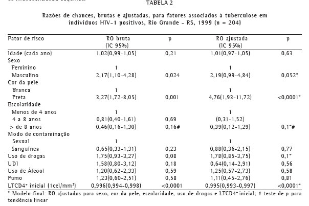 Os resultados do presente estudo mostram que, após ajuste com outras variáveis, a TBC foi mais freqüente nos indivíduos de raça negra, com menor contagem de LTCD4+. Com respeito ao nível de LTCD4+, embora o grau de imunossupressão seja o fator isolado mais importante para o desenvolvimento e forma de apresentação da TB,(7,26) o aumento do risco de TB em áreas endêmicas para esta infecção logo após a contaminação pelo HIV, quando o sistema imune ainda está preservado, pode ser maior do que o anteriormente suposto. Alguns autores encontraram o dobro da incidência de TB no primeiro ano após a infecção pelo HIV e quatro vezes maior nos dois anos seguintes.(28)