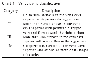 Before a stent is placed into the superior vena cava, a venogram, in two different positions, should be performed in order to determine the extent, severity and location of the obstruction. Prior to the intervention, the collateral venous network should be carefully evaluated, and any thrombi or tumor invasions should be investigated. The venographic classification of the obstruction, according to the criteria established by Stanford and Doty, should also be determined in order to estimate the possibility of complications such as cerebral edema and respiratory impairment (Chart 1).(25) The measurement of pressures can also aid in the determination of the SVCS severity. In one study sample, the placement of stents was only indicated when the peripheral pressure of the vena cava was greater than 22 mmHg.(26) Of the 9 SVCS patients in that sample, 3 presented pressure lower than 22 mmHg and were therefore not submitted to stent placement. In those cases, the syndrome remained stable, without therapeutic intervention, up until the death of the patients from the underlying disease. However, the majority of the authors have based their therapeutic decisions solely upon clinical findings.