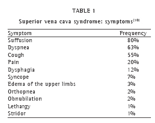 TREATMENT OPTIONSThe treatment of SVCS depends on the severity of the symptoms and the cause of the obstruction, as well as on the histological type and stage of the tumor produced. Measures such as reclining the patient and elevating the head, as well as controlling the volume of oxygen administered and the oxygen supplementation, are valid alternatives for use prior to diagnosis and initiation of the definitive treatment. The roles played by diuretics and corticosteroids in the treatment of SVCS remain unclear. Despite being described as a medical emergency, SVCS rarely acquires that characteristic. In a review of 90 studies describing 1,986 cases de SVCS, only one death, from bronchial aspiration of epistaxis, was directly attributed to SVCS.(7) Among the serious complications described are cerebral and laryngeal edema, although these are rarely seen in current practice. In fact, cerebral edema is often related to metastatic foci in the brain and respiratory impairment (consequent to compression of the trachea by the tumor) and not as a result of the SCVS per se. Therefore, as previously mentioned, the treatment of SVCS can be initiated prior to an appropriate evaluation of its etiology.(8-9)