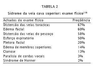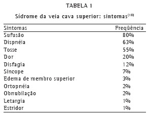 A Síndrome da Veia Cava Superior (SVCS) representa um conjunto de sinais (dilatação das veias do pescoço, pletora facial, edema de membros superiores, cianose) e sintomas (cefaléia, dispnéia, tosse, edema de membro superior, ortopnéia e disfagia, entre outros) decorrentes da obstrução do fluxo sanguíneo através da veia cava superior em direção ao átrio direito (Tabelas l e 2).