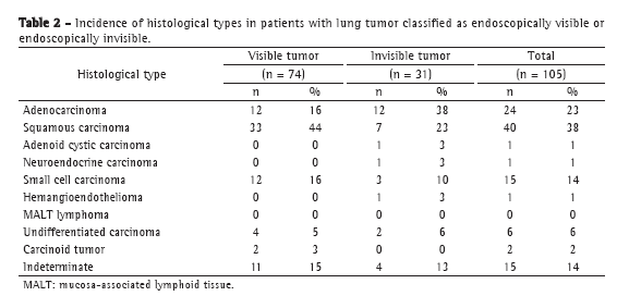 As can be seen in Table 2, 45% of the endoscopically visible tumors were squamous carcinomas, whereas 39% of the endoscopically invisible tumors were adenocarcinomas. Small cell carcinoma predominated in the group of visible tumors. These findings are in agreement with those reported by other authors.(3)