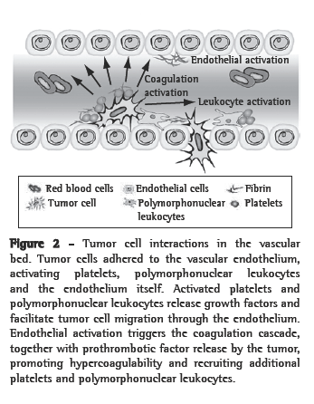 Cell activationPlatelets are particularly affected by cancer: up to 30% of patients present increases in platelet count, whereas 11% present decreases.(10) It has been demonstrated that in vitro platelets aggregate in the presence of cancer cells and there is thrombocytopenia when cancer cells are infused in vivo.(11) Platelet activation can be mediated by direct cell-to-cell contact and by the release of several factors, such as adenosine diphosphate, thrombin, other proteases and interleukins. Activated platelets have greater adhesive capacity and interact with other cells, such as leukocytes, endothelial cells and tumor cells.(12). Tumor emboli are usually enfolded within a fibrin-platelet net that contributes to endothelial adhesion. This tumor thrombus, adhered to the endothelium, causes a lesion, and consequently, there is the release of vascular permeability factor, as well as the local loss of inhibition of platelet aggregation, anticoagulation and vasodilation.(6)