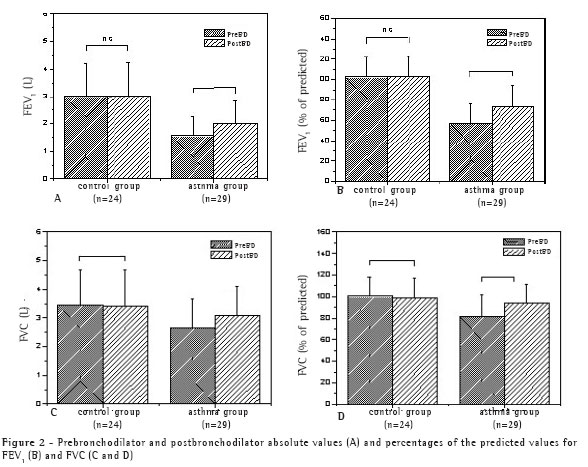 The results are presented as means ± standard deviations. Statistical analysis was carried out using ORIGIN 6.0 program. Paired Student's t-test was used for the prebronchodilator and postbronchodilator analysis of changes, and unpaired Student's t-test was used in the comparison between the control group and the study group. The level of statistical significance was set at p = 0.05.