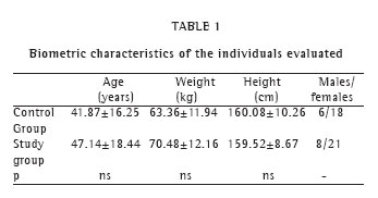 RESULTSTable 1 shows the biometric characteristics of the subjects. We should highlight the fact that, although there were slight age- and weight-related differences between the groups, these differences were not significant (p > 0.05). Another important observation is the fact that these parameters are not determinants in terms of alterations in respiratory impedance, since the main parameter that has significant influence on the impedance - subject height(18) - was quite similar between the groups under study.