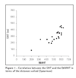 Results are expressed as means and standard deviations. We used the Wilcoxon test to analyze the differences between the SWT and the E6MWT. The Spearman correlation coefficient was used to determine the associations between continuous variables. Non-parametric tests were justified using the Kolmogorov-Smirnov test. Sample size had an 80% power to detect a 10-meter difference in the SWT (estimating an 11-meter standard deviation),(21-22) assuming an alpha error of 0.05. We used the SPSS program, version 10.0, to make the statistical analysis.