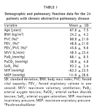 A cross-sectional descriptive study was conducted. A total of 24 consecutive patients with COPD(1) were selected from among patients treated at the COPD clinic of the Pulmonary Rehabilitation Center of the Federal University of São Paulo.