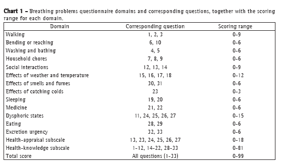 The BPQ is a disease-specific questionnaire for patients with chronic lung disease, having been developed by Hyland in 1994 and consisting of 33 questions divided into 13 domains. A higher score translates to a greater impact of respiratory problems on the HRQoL of patients with chronic lung diseases.(7) The domains and their corresponding questions are shown in Chart 1. The BPQ has two versions (i.e., the long version and the short version). In the present study, we evaluated the reproducibility of the long version. The short version of the BPQ consists of 10 questions, and this reduces the time to complete the questionnaire. In addition, the short version correlates well with the total score on the long version of the questionnaire. However, the short version does not allow the construction of health subscales. Had we chosen to validate the short version, this would have limited the amount of information on the health status of the participants and the correlations thereof. Therefore, we decided to validate the long version of the BPQ for use in Brazil. However, if the long version proves to be reproducible, the short version can also be used if necessary.