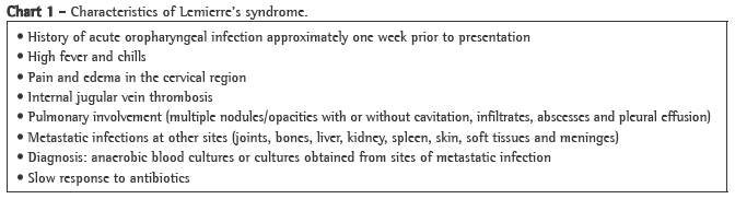 In most cases, the infection originates in the palatine tonsils and circumjacent tissues. However, it can also initiate as pharyngitis, parotitis, otitis media, sinusitis, odontogenic infection or mastoiditis. Subsequently, there is infection of the lateral pharyngeal space, through which the IJV passes, leading to IJV septic thrombophlebitis. The bacteremia is complicated by septic embolus migration to various sites, such as the lungs (most commonly), joints and bones. In the pre-antibiotic era, this syndrome was not uncommon, and had a fulminant evolution, typically resulting in death within 7 to 15 days. Although Lemierre's syndrome is currently rare, there is evidence of its resurgence in recent years, and there are a number of case reports in the literature. This is likely related to the fact that the use of antimicrobial agents for the treatment of upper respiratory tract infections is restricted in order to avoid the unnecessary use of such agents in cases of viral etiology. No cases similar to the one reported here have been described in Brazil.(1-4)