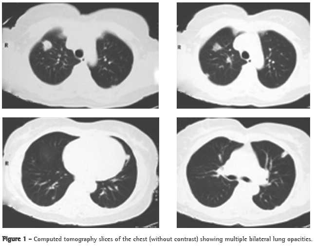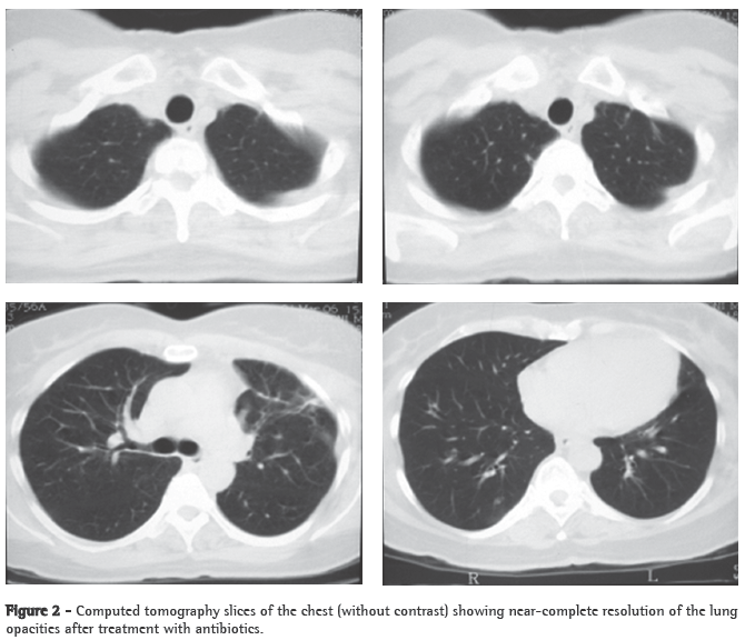 Case reportA 56-year-old Caucasian female sought treatment in the emergency room presenting a painful, right-sided neck tumor for 5 days. The patient reported a dry cough and high fever for 3 days. She described herself as a nonsmoker. She was hypertensive and diabetic. She had experienced a myocardial infarction 3 years prior. At admission, the patient was dehydrated and afebrile (axillary temperature, 36.7°C). She presented normal respiration. Laboratory tests revealed increased erythrocyte sedimentation rate (92 mm). Ultrasound of the neck showed IJV thrombosis, and anticoagulation was started on post-admission day 4. A chest X-ray demonstrated at least two nodules in the left lung, one apparently cavitated and one with a diameter of 18 mm at its base, as well as an irregular lesion, 25 mm in diameter, in the right upper lung lobe. A transesophageal echocardiogram, performed in order to rule out endocarditis, demonstrated no vegetation. Due to the hypothesis of pneumonia, empirical treatment with oral cefuroxime (500 mg every 12 h) was started. A computed tomography scan of the chest revealed multiple bilateral lung opacities, with an aspect suggestive of metastatic implants (Figure 1). The patient was then submitted to fiberoptic bronchoscopy, the findings of which were normal. In the microbiological analysis of the bronchoalveolar lavage fluid, testing for acid-fast bacilli and fungi were negative, as were the cytopathologic study and cultures. Since the working diagnosis was metastatic neoplasm, the patient underwent surgical lung biopsy. The anatomopathological examination of the sample showed chronic suppurative inflammation with organizing abscesses in lung parenchyma. In view of the hypothesis of Lemierre's syndrome caused by jugular thrombosis accompanied by septic pulmonary embolism, the patient was questioned regarding the occurrence of tonsillitis at the onset of the disease. The patient had no recollection, but her daughter remembered that the patient had used oral amoxicillin (500 mg every 8 h for 10 days) for the treatment of tonsillitis some days prior to hospitalization. At hospital admission, the patient received a course of intravenous cefuroxime (750 mg every 8 h for 7 days) concomitantly with oral azithromycin (500 mg once a day for 5 days). Subsequently, because fever persisted, she was treated with cefepime (1,000 mg every 12 h for 7 days). A control computed tomography scan of the chest performed after this course of antibiotics showed nearly complete resolution of the opacities (Figure 2). The patient had been afebrile since the third day of the new course of antibiotics. No microorganisms were isolated from blood cultures or bronchoalveolar lavage cultures. Since there is no evidence that it is beneficial in cases of Lemierre's syndrome, anticoagulation was discontinued after 20 days.