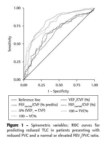 In relation to restriction, the specificity of spirometric criteria is greater than is their sensitivity.(2,3,9) However, our data show that, by combining clinical and spirometric data, restriction can, in many cases, be reliably diagnosed. A large decrease in FVC is thought to reflect reduced TLC in patients presenting with an FEV1/FVC ratio above the lower limit of normality.(3,9) In a recent study involving patients without obstruction,(9) restrictive impairment could be predicted with a probability of > 95% if the measured value of FVC fell below 55% of the predicted value in males or below 40% of that in females. In the present study, gender-based differences in FVC cut-off values were also found, but the values with the best discriminatory power were slightly different: < 60% in males; and < 50% in females.