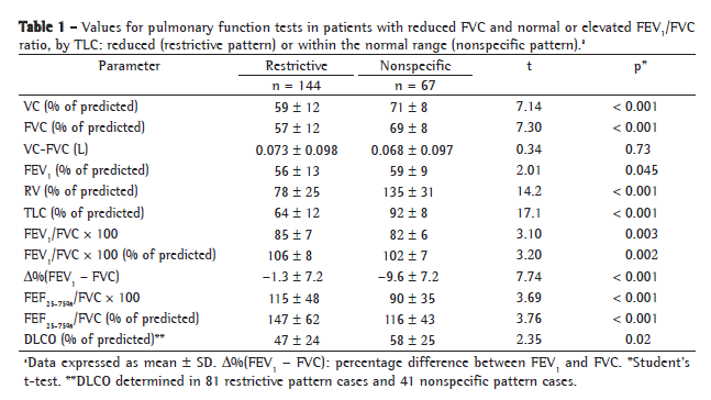 The TLC was measured by plethysmography in 193 cases and by helium dilution in 18. The restrictive pattern (reduced TLC) was identified in 144 cases, and the nonspecific pattern (normal TLC) was identified in 67. The proportion of smokers/ex-smokers did not differ significantly between the two groups (24% in the restrictive pattern group vs. 16% in the nonspecific pattern group; p = 0.44). Of the 211 patients evaluated, 69 (33%) were obese. The proportion of obese patients did not differ significantly between the two groups (39% in the nonspecific pattern group vs. 30% in the restrictive pattern group; p = 0.20).