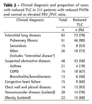 In the present study, clinical diagnoses were valuable for increasing or decreasing the predictive value for a diagnosis of restriction. As expected, many patients with a working clinical diagnosis of obstructive disease presented normal TLC. However, the final diagnosis could not be ascertained for the cases in which the clinical diagnosis on the spirometry request form was COPD and the patient presented with reduced TLC on plethysmography.