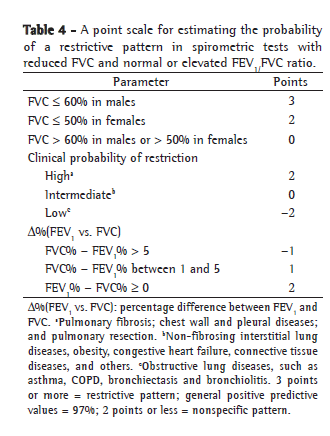 Spirometry is quite useful for excluding the restrictive pattern. When VC is within the normal range, the probability of restriction is quite low.(2,3,9)