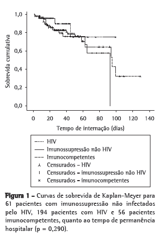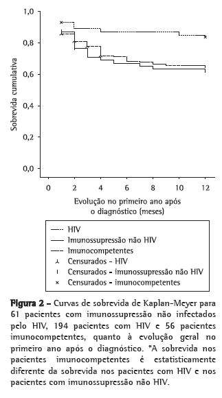 A Figura 1 mostra as curvas de sobrevida de Kaplan-Meyer para pacientes com imunossupressão não infectados pelo HIV, pacientes com HIV e pacientes imunocompetentes, quanto ao tempo de permanência hospitalar. As taxas de mortalidade intra-hospitalar para os imunocomprometidos não HIV, os HIV positivos e os imunocompetentes foram 21,3% (13/61), 17,0% (33/194) e 7,1% (4/56), respectivamente. Não houve diferença estatisticamente significativa na sobrevida entre os grupos (p = 0,290). A Figura 2 mostra as curvas de sobrevida para os três grupos, considerando a evolução geral no primeiro ano após o diagnóstico hospitalar. As taxas de mortalidade após a alta para os imunocomprometidos não HIV, os HIV positivos e os imunocompetentes foram 14,8% (9/61), 18,0% (35/194) e 8,9% (5/56), respectivamente. Houve diferença estatisticamente significativa entre os três grupos (p = 0,022), sendo que os pacientes imunocompetentes tiveram sobrevida maior que os pacientes com HIV (p = 0,008) e que os pacientes com imunossupressão não HIV (p = 0,015). A sobrevida dos pacientes com imunossupressão não HIV não diferiu da sobrevida dos pacientes com HIV (p = 0,848).