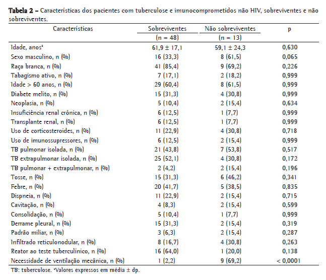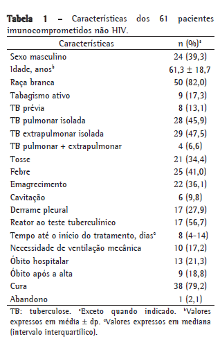 Em conclusão, demonstramos as características de pacientes imunocomprometidos não infectados pelo HIV e que necessitaram de hospitalização. A menor prevalência de sintomas clássicos, a ocorrência de TB extrapulmonar, o retardo no início do tratamento e a alta taxa de mortalidade refletem o desafio diagnóstico e terapêutico da TB nesses pacientes.