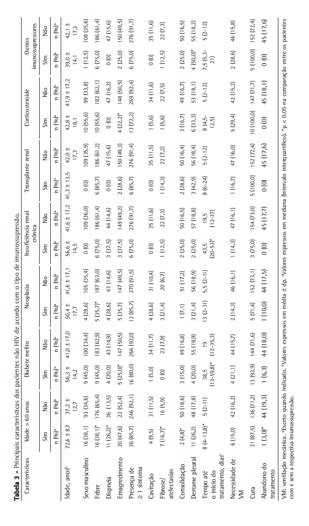 Dos pacientes com imunossupressão não relacionada ao HIV, 37 tinham mais de 60 anos, 19 eram diabéticos, 15 eram usuários de corticosteroides, 8 estavam em uso de outros imunossupressores, 7 tinham insuficiência renal crônica, 7 eram transplantados, e 7 eram portadores de neoplasias. Alguns pacientes apresentavam mais de uma forma de imunossupressão. As principais características dos pacientes estão demonstradas na Tabela 1.