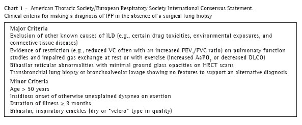 In 1999, members from the American Thoracic Society (ATS) and European Respiratory Society (ERS) collaborated to review over 3500 articles published in the scientific literature for information pertaining to IPF's physiology, radiology, and pathology; its pathogenesis, epidemiology, clinical presentation, and staging; its inheritance or familial occurrence; its treatment; and its prognosis.(4) These experts produced an international consensus statement that comprehensively discusses IPF and includes criteria that can be used to make a diagnosis of IPF with and without performing a lung biopsy (Chart 1).