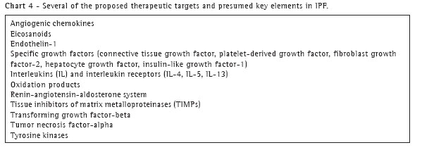 Ideally, a biologic target in IPF should fulfill three criteria: 1) there should be strong biologic evidence supporting the target as important in pathogenesis; 2) it should be differentially expressed in the presence and absence of disease; and 3) altering the level (or activity) of the target should lead to modification of disease development or its course.(33) As we currently understand IPF, the beneficial manipulation of an appropriate target should result in limiting or even reversing the amount of lung fibrosis. Several potential mechanisms are considered appropriate sites for investigation and intervention, including: 1) decreasing lung fibroblast migration, proliferation, and differentiation; 2) decreasing the synthesis and deposition of extracellular matrix (ECM); 3) increasing the degradation of aberrantly deposited ECM; 4) enhancing fibroblast/myofibroblast apoptosis; 5) inhibiting inappropriate alveolar epithelial cell apoptosis; 6) enhancing alveolar basement membrane re-epithelialization; 7) disrupting EMT; and 8) modulating angiogenic activity. Within these pathways, particular molecular targets are attractive candidates for modulation and include: transforming growth factor-beta (TGF-b), glutathione, tumor necrosis factor-alpha (TNF-a), endothelin, and several others (Chart 4).(34)